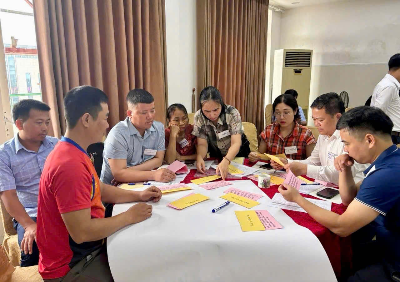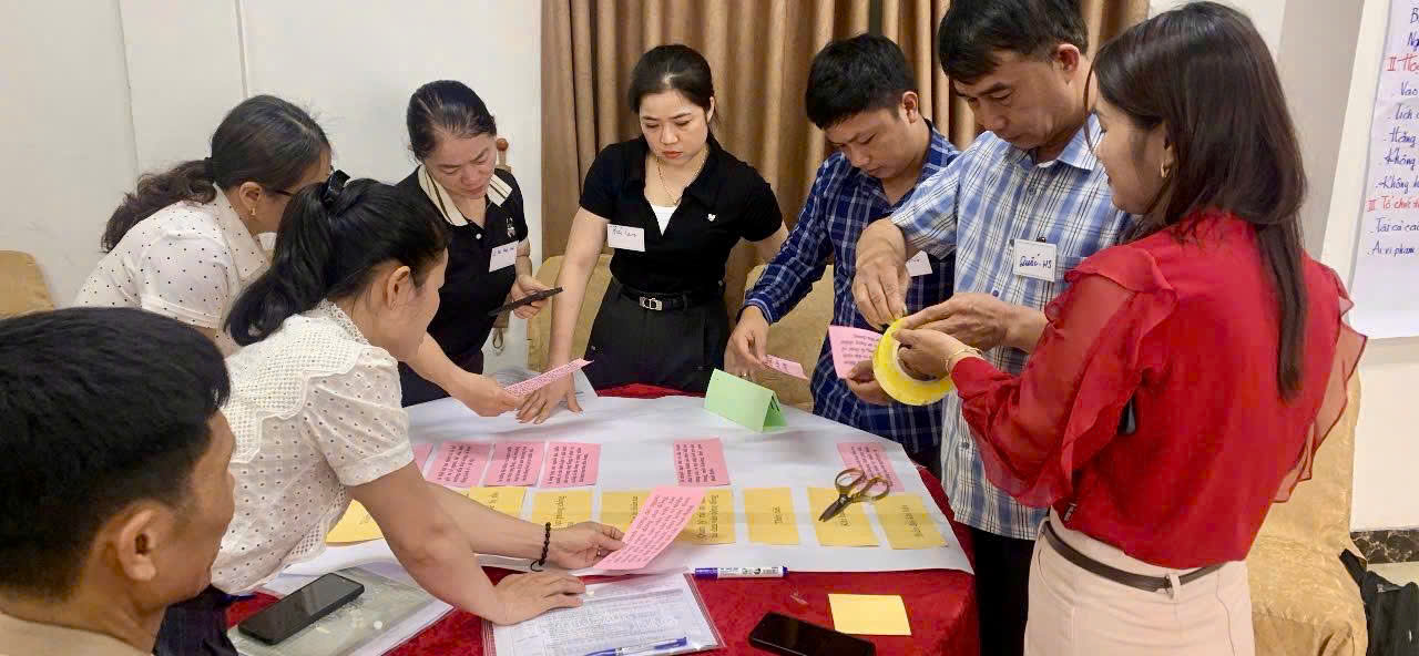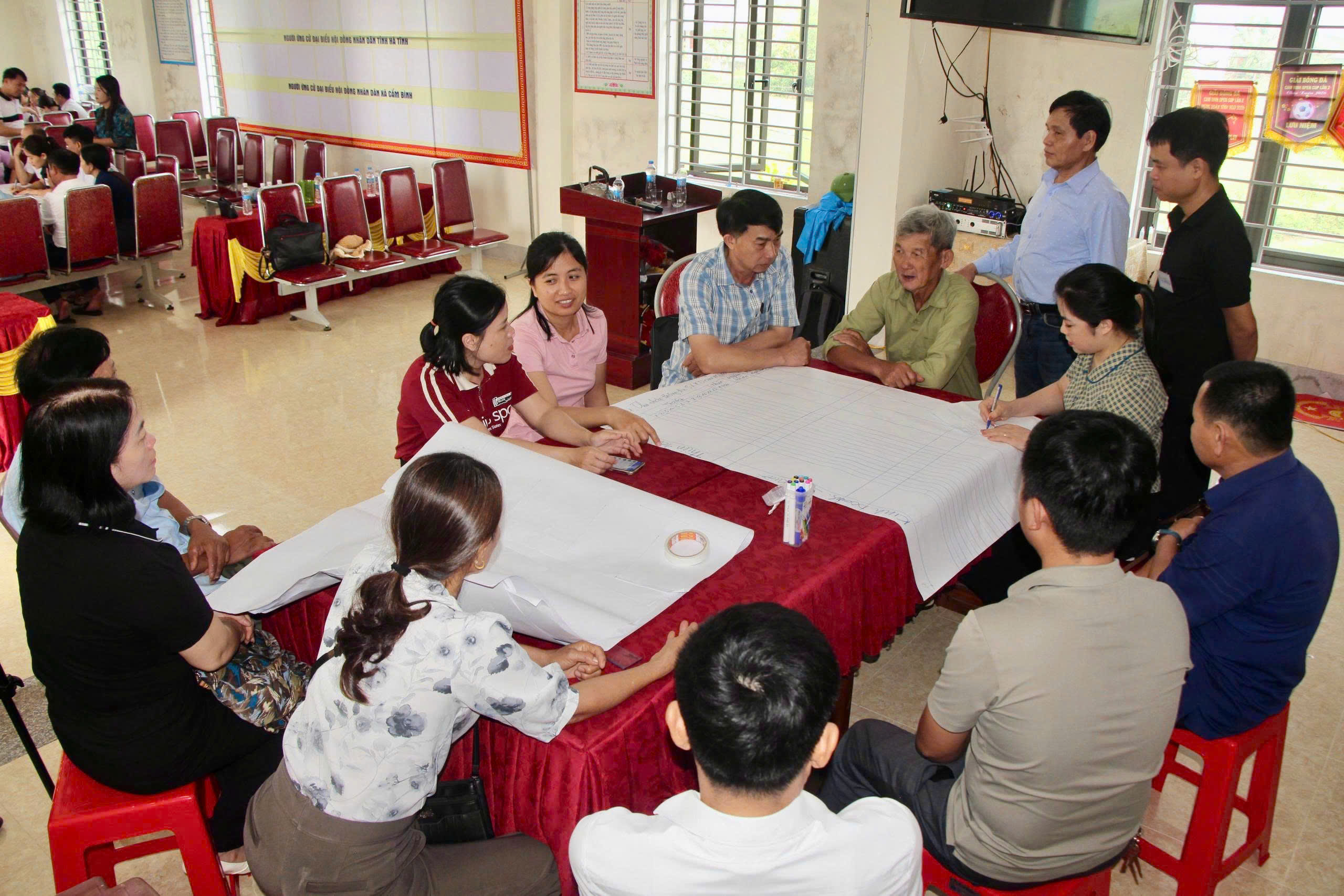 Đặc biệt, trong khuôn khổ chương trình tập huấn, các học viên đã được tham gia thực hành trực tiếp các công cụ đánh giá rủi ro thiên tai dựa vào cộng đồng tại xã Cẩm Bình. Thông qua hoạt động thực tế, học viên được áp dụng các phương pháp như lập bản đồ rủi ro, phân tích lịch sử thiên tai, xác định các khu vực dễ bị tổn thương và nguồn lực sẵn có tại địa phương. Qua đó, giúp nâng cao kỹ năng thực hành, khả năng làm việc với cộng đồng và vận dụng hiệu quả vào quá trình hỗ trợ các xã triển khai đánh giá rủi ro và xây dựng kế hoạch phòng, chống thiên tai trong thời gian tới.