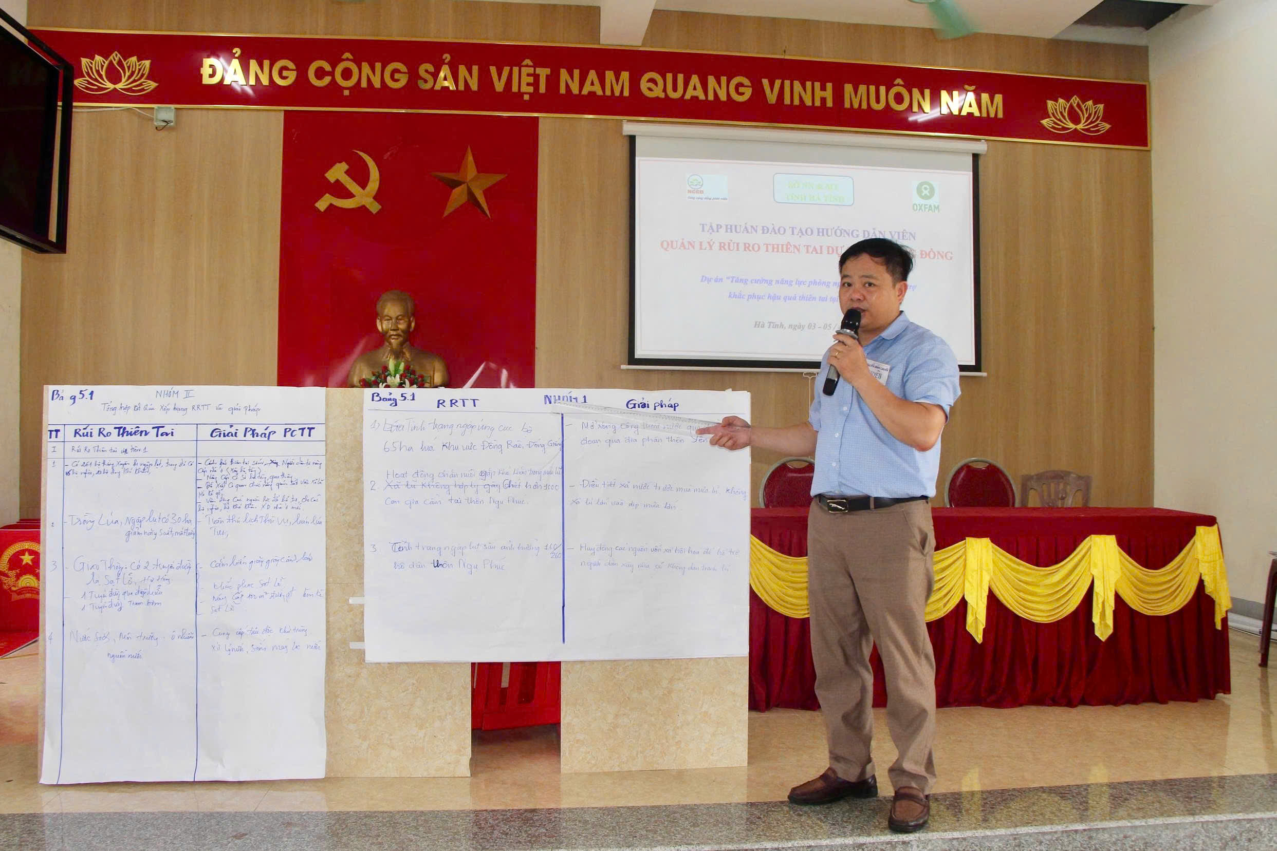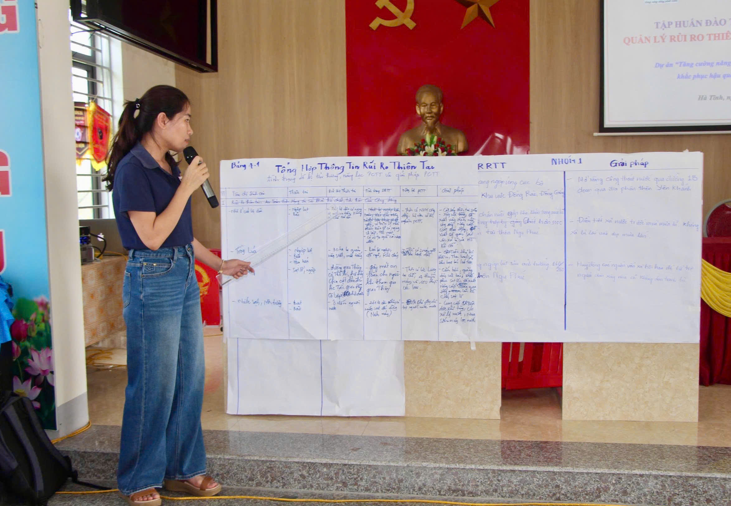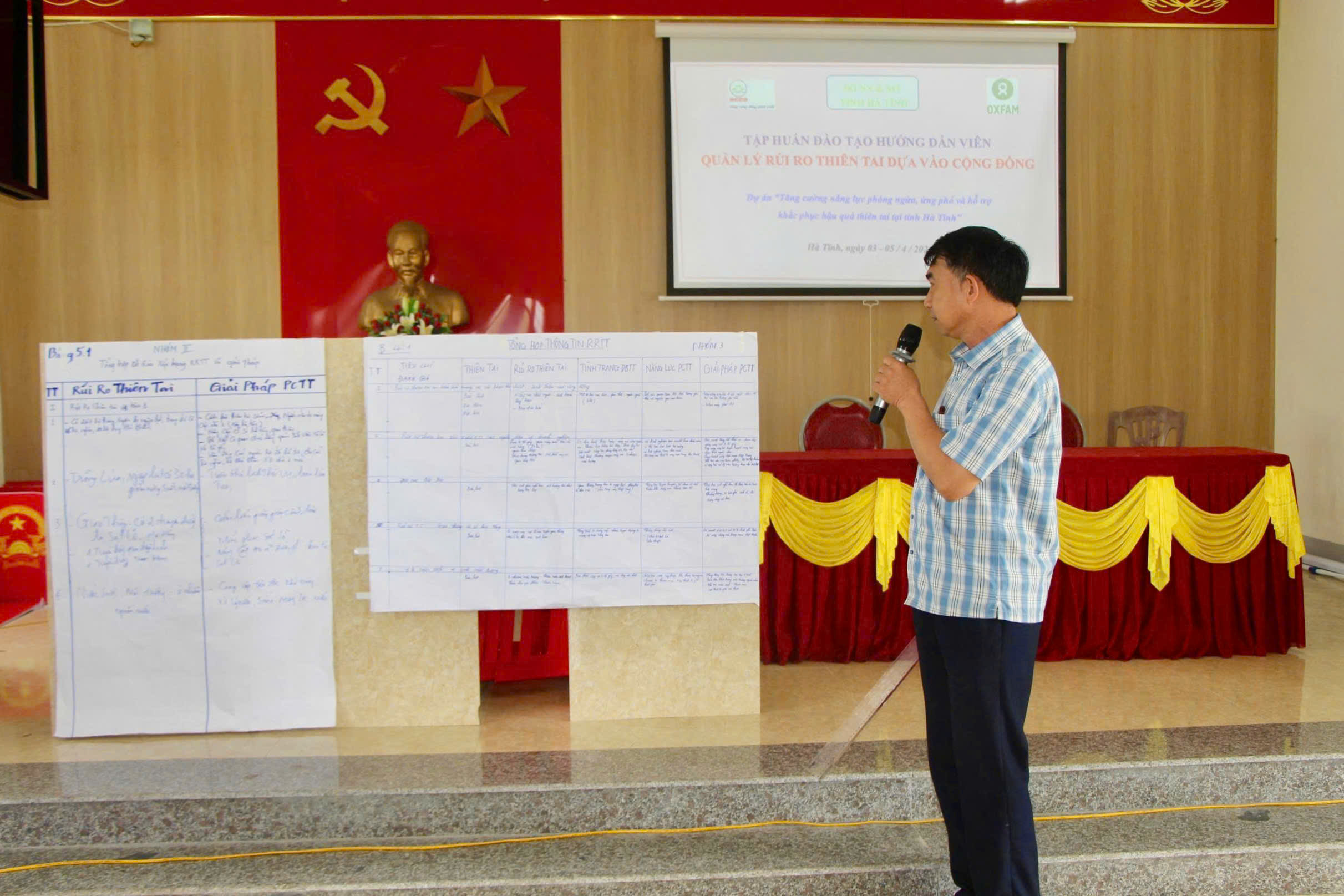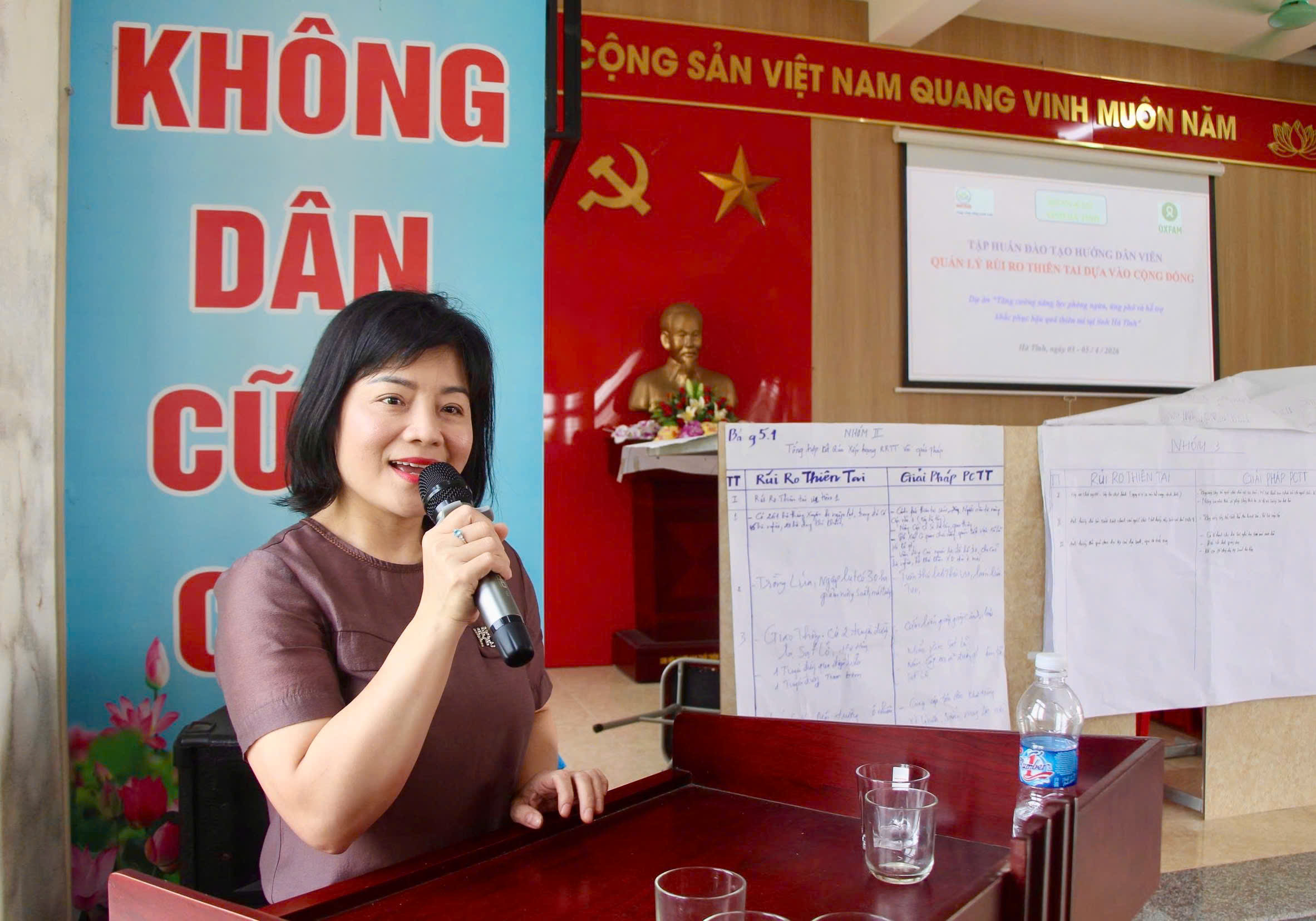 Tham gia tập huấn, các học viên của 3 xã thực hiện dự án là Thượng Đức, Vũ Quang, Hương Sơn được các giảng viên truyền đạt 08 chuyên đề, gồm: Diễn biến các loại hình thiên tai từ 2020-2025 ở tỉnh Hà Tĩnh; Giới thiệu Đề án “ Nâng cao nhận thức cộng đồng và Quản lý rủi ro thiên tai dựa vào cộng đồng đến năm 2030” của Thủ tướng Chính phủ và Kế hoạch thực hiện Đề án của tỉnh Hà Tĩnh; Một số khái niệm về rủi ro thiên tai và Biến đổi khí hậu; Quản lý rủi ro thiên tai dựa vào cộng đồng; Lồng ghép giới trong quản lý rủi ro thiên tai dựa vào cộng đồng; Đánh giá rủi ro thiên tai dựa vào cộng đồng; Hướng dẫn các công cụ đánh giá rủi ro thiên tai dựa vào cộng đồng; Hướng dẫn lập kế hoạch phòng, chống thiên tai dựa vào cộng đồng.