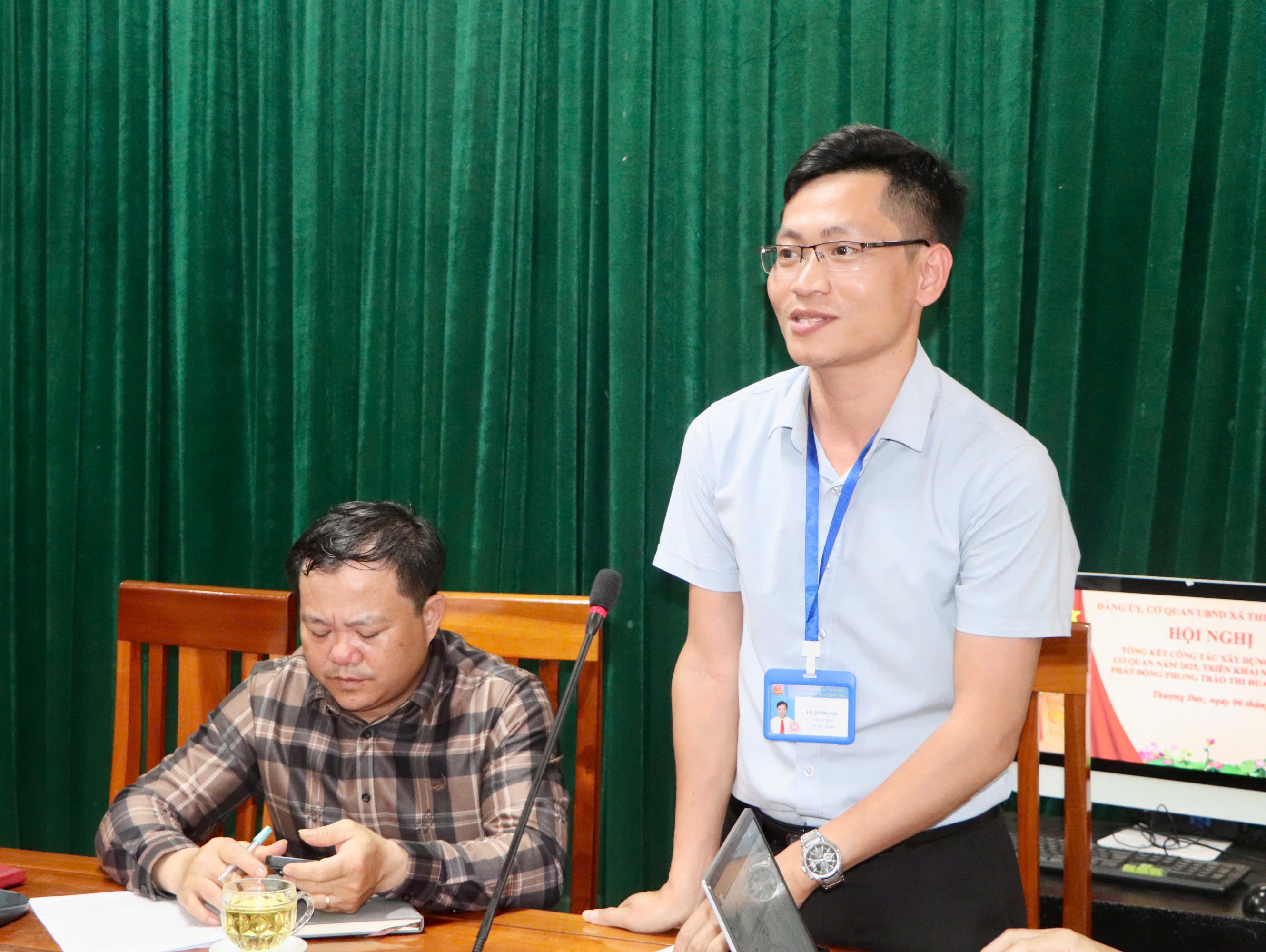 Chủ trì Hội nghị có các đồng chí: Nguyễn Thanh Sơn- Phó Bí thư Đảng ủy, Chủ tịch UBND xã, Bí thư Đảng ủy cơ quan UBND xã; Đậu Đình Dân- Phó Chủ tịch UBND xã, Phó Bí thư Đảng ủy cơ quan UBND xã; Trương Thanh Hà – Phó Chủ tịch UBND xã.