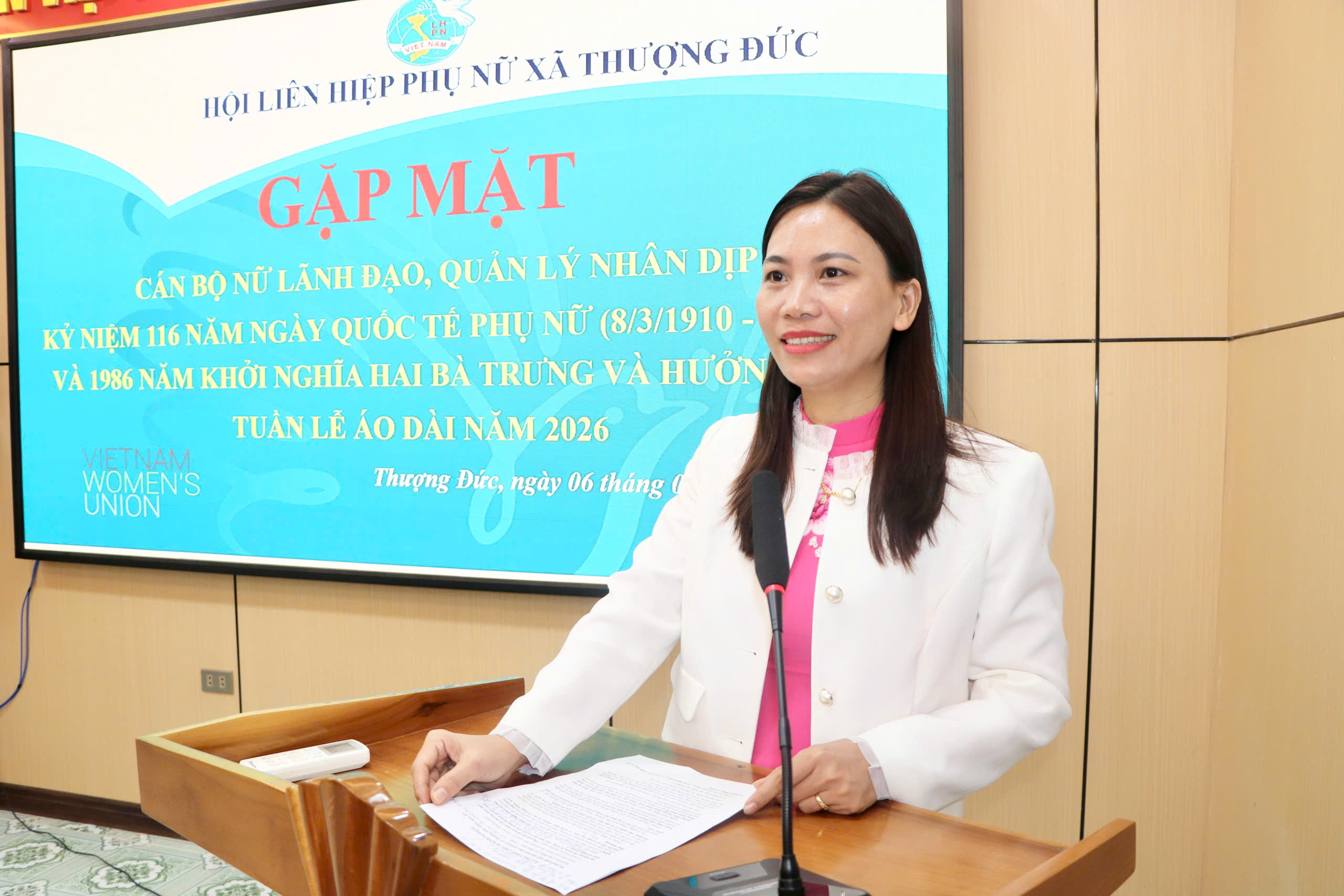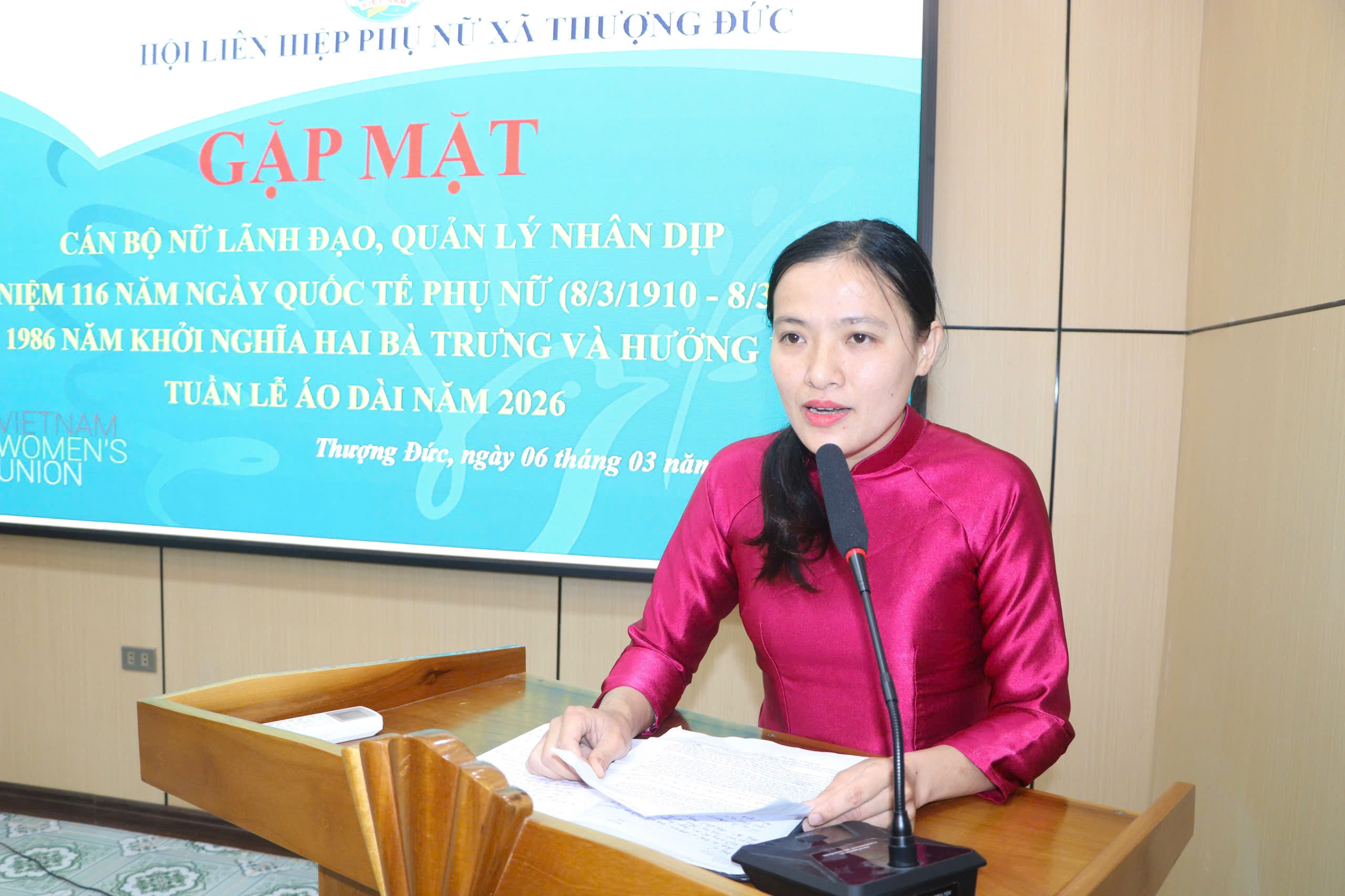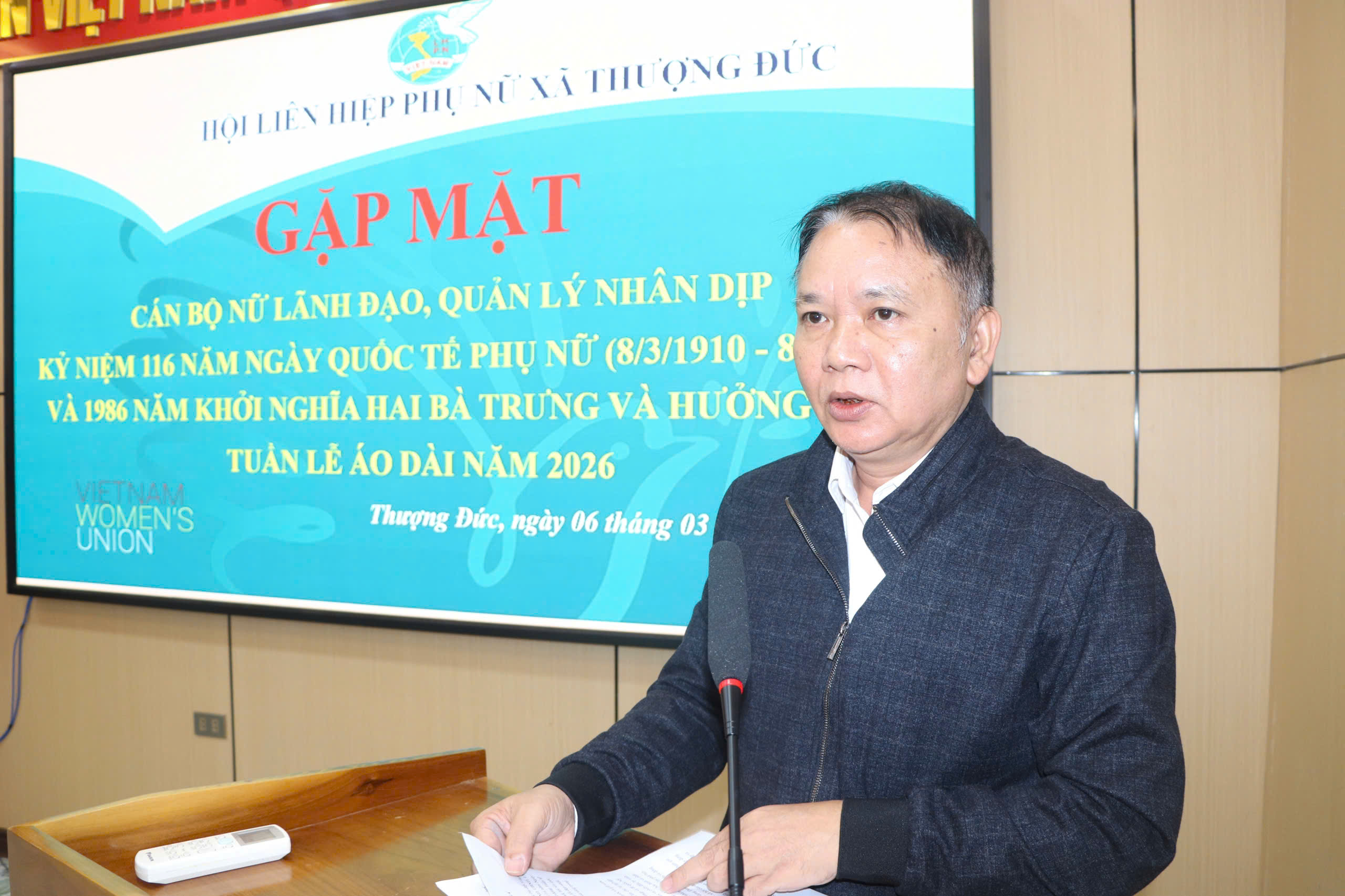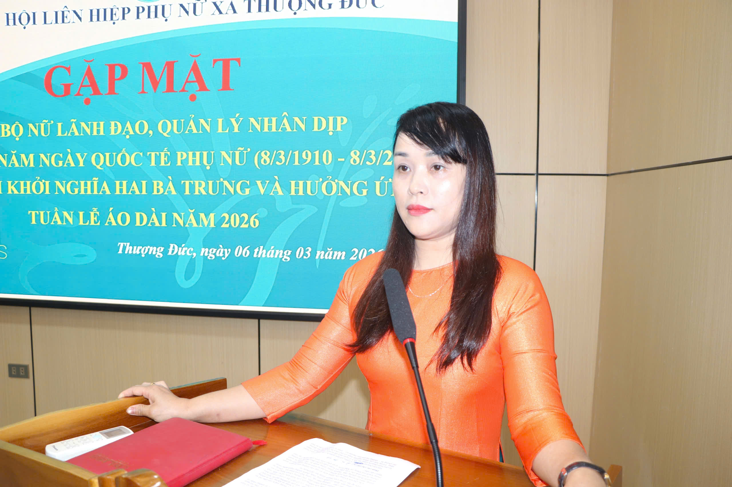 Phát biểu tại buổi gặp mặt, đồng chí Lê Thanh Yên- UVBTV, Chủ tịch Ủy ban MTTQ xã đã gửi lời chúc mừng tốt đẹp tới toàn thể cán bộ nữ lãnh đạo, quản lý và hội viên phụ nữ nhân dịp kỷ niệm 116 năm Ngày Quốc tế Phụ nữ 8/3 và 1986 năm Khởi nghĩa Hai Bà Trưng. Đồng chí ghi nhận và biểu dương những đóng góp tích cực của phụ nữ xã Thượng Đức trong thời gian qua trên các lĩnh vực công tác, đặc biệt là sự năng động, sáng tạo của đội ngũ cán bộ nữ trong thực hiện nhiệm vụ chính trị, phát triển kinh tế - xã hội, xây dựng gia đình hạnh phúc và tham gia các phong trào thi đua tại địa phương.