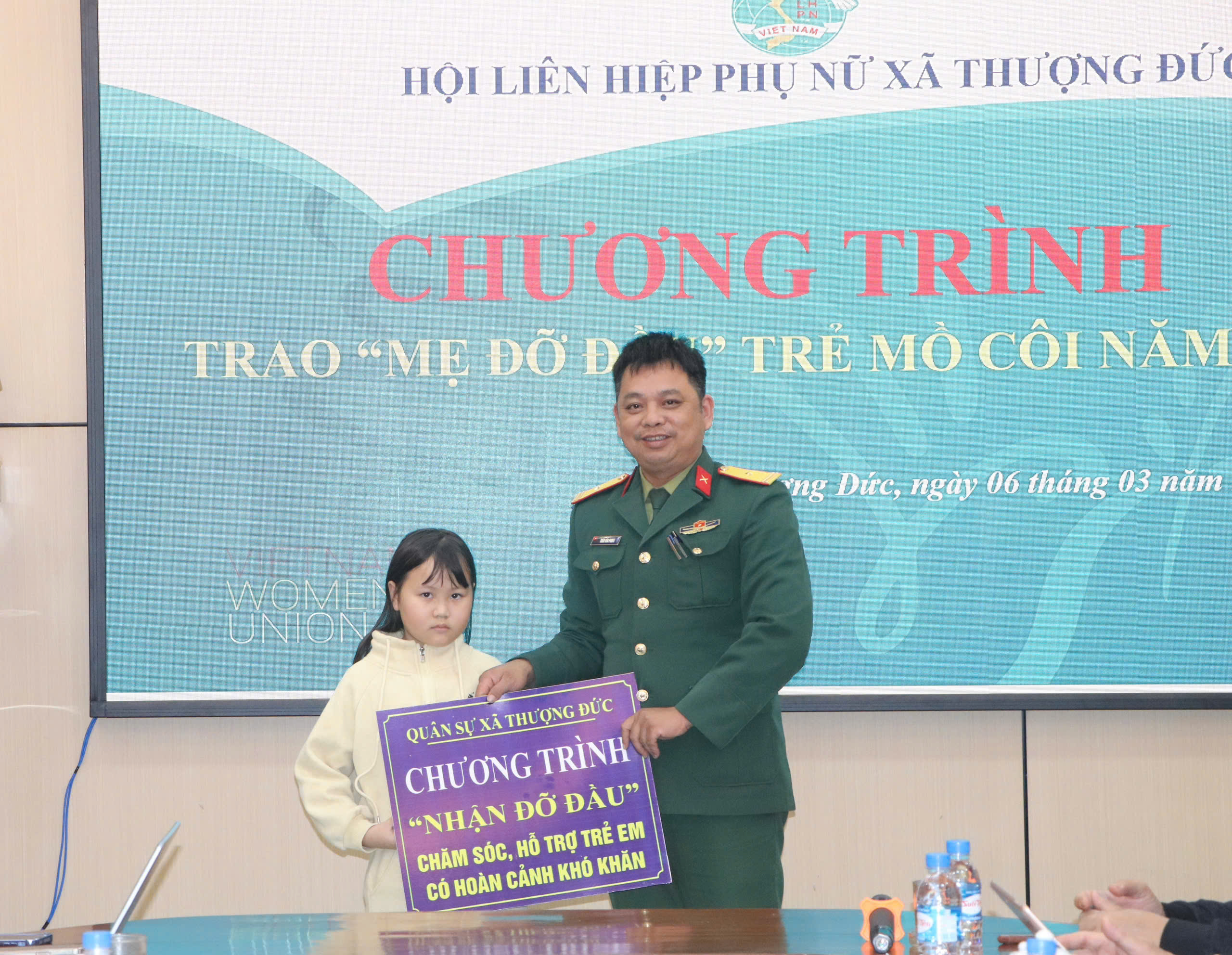 Nhân dịp này, Ban CHQS xã, Công an xã và Hội LHPN xã Thượng Đức đã nhận đỡ đầu 3 trẻ em mồ côi có hoàn cảnh khó khăn trên địa bàn. Lãnh đạo xã Thượng Đức cũng đã tặng hoa chúc mừng Hội LHPN tỉnh, Hội LHPN xã cùng các đồng chí cán bộ nữ lãnh đạo, quản lý trên địa bàn nhân dịp kỷ niệm 116 năm ngày Quốc tế phụ nữ 8/3.