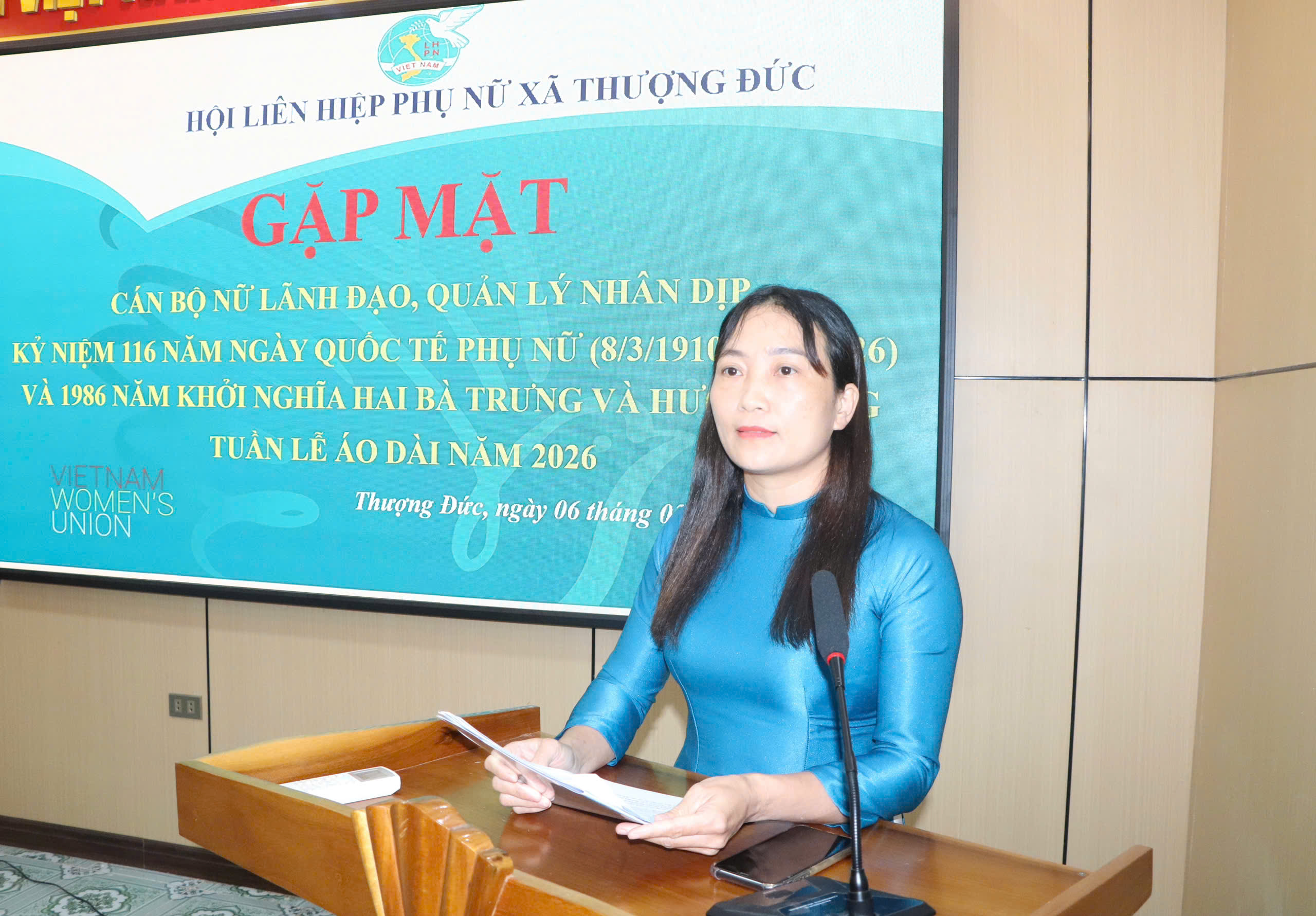 Đồng chí cũng đề nghị trong thời gian tới, Hội LHPN xã tiếp tục phát huy vai trò nòng cốt trong công tác vận động, tập hợp hội viên, đẩy mạnh các phong trào thi đua, các cuộc vận động do Hội cấp trên phát động; quan tâm thực hiện hiệu quả Chương trình “Mẹ đỡ đầu”, góp phần chăm lo, hỗ trợ trẻ em mồ côi, trẻ em có hoàn cảnh khó khăn trên địa bàn. Đồng thời, mong muốn đội ngũ cán bộ nữ lãnh đạo, quản lý tiếp tục phát huy năng lực, tinh thần trách nhiệm, đóng góp tích cực vào sự phát triển chung của xã Thượng Đức trong thời gian tới.